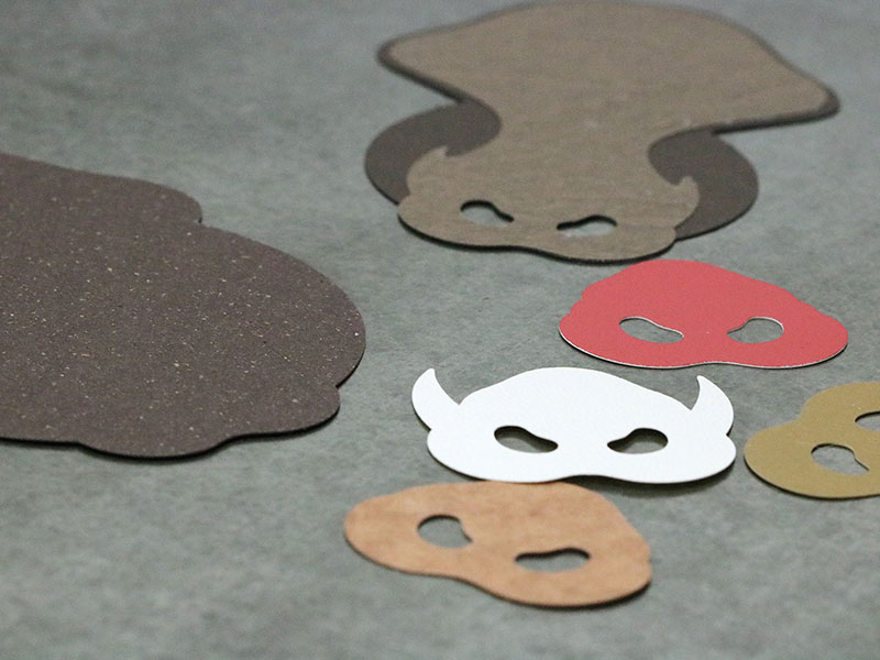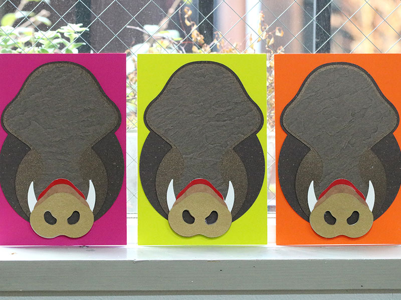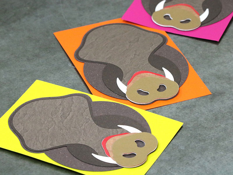 まずは、猪の野性的な質感を表現するためにビア・ペーパー-FSをベースに単調にならないようにスタードリーム-FS ブロンズの上品な光沢でアクセント。ゴワゴワっとした毛の質感を表現するのに岩はだを選定し、年賀状なので、めでたい印象を表現するため、他の質感とは違うテカッとしたツヤ感のルミナカード。牙の部分は、白の紙でも少し凹凸がほしいためクロコGAを選定。鼻の質感を出すために、皮膚感を感じさせる羊皮紙。そして最後に、豪華さと遠近感を出すためにスタードリーム-FS アンティークゴールドを選定しています。(有限会社クロト 井手さん)