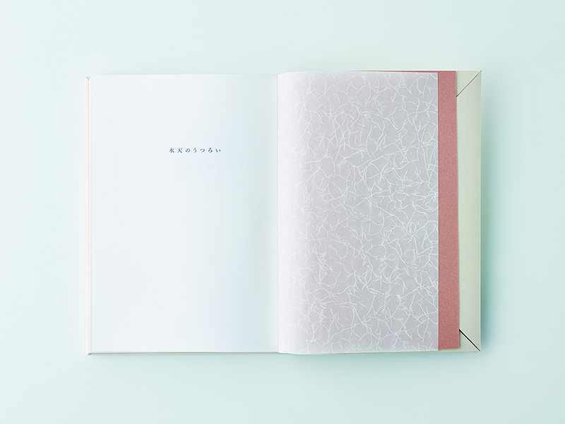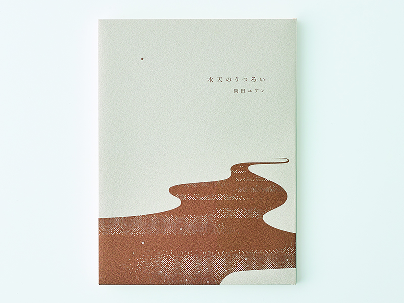 - 私が装幀をした『水天のうつろい』は、著者の岡田ユアンが自身の子供をうみ出す前後の時間を綴った詩集である。「水天」は仏教における水の神様で、日本では安産・子授けの神様として知られている。詩集の表紙は、永遠の時を持つ宇宙に一筋の水が流れ新たな時間が始まることを示唆している。ファインペーパー い織りの静かな和のテクスチャーが、ブロンズインクで刷られた水面に浮かび上がり、スモークホワイトの偏りのないニュートラルな色調が空間を際立たせる。新しくうみ出された言葉たちを、フランス装に想を得た繊細な造本で包んだ。(長澤昌彦さん)