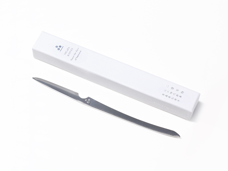 - 二唐刃物のある青森県弘前市は津軽地方と呼ばれ、平安時代は大規模な製鉄が行われていました。江戸時代になると100軒以上もの鍛冶屋があったと言われており、その中の1つである二唐刃物は350年の伝統があります。ペーパーナイフはその伝統と技術をお手元で楽しんでいただこうと鍛治職人が一本一本丁寧に仕上げたものです。刀をイメージしたペーパーナイフとレターオープナーを収める函には、独特な手触りが高級感を感じさせるNTスフールの中から、青森の雪のようなスノーホワイトを選びました。(長澤昌彦さん)
