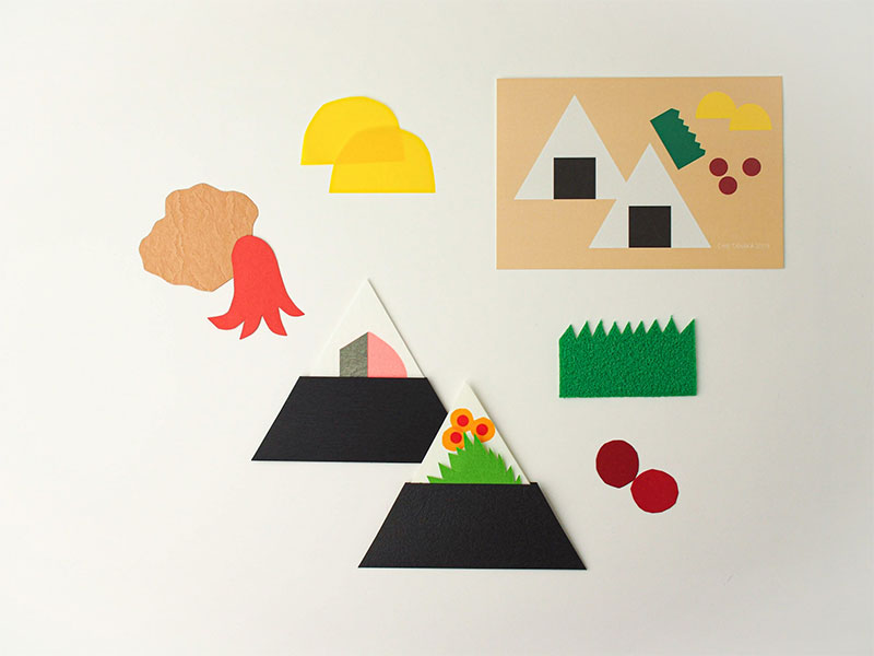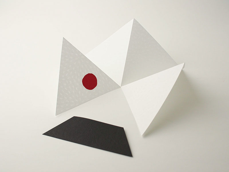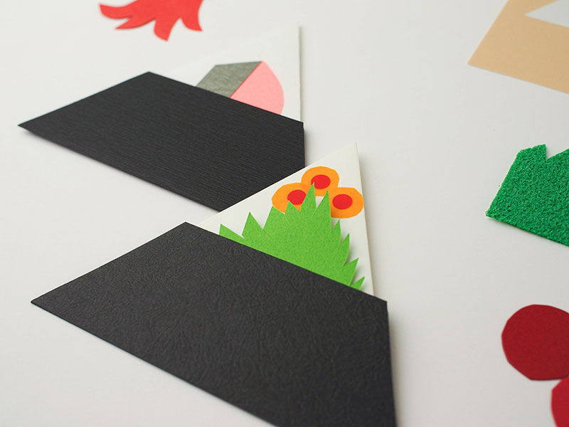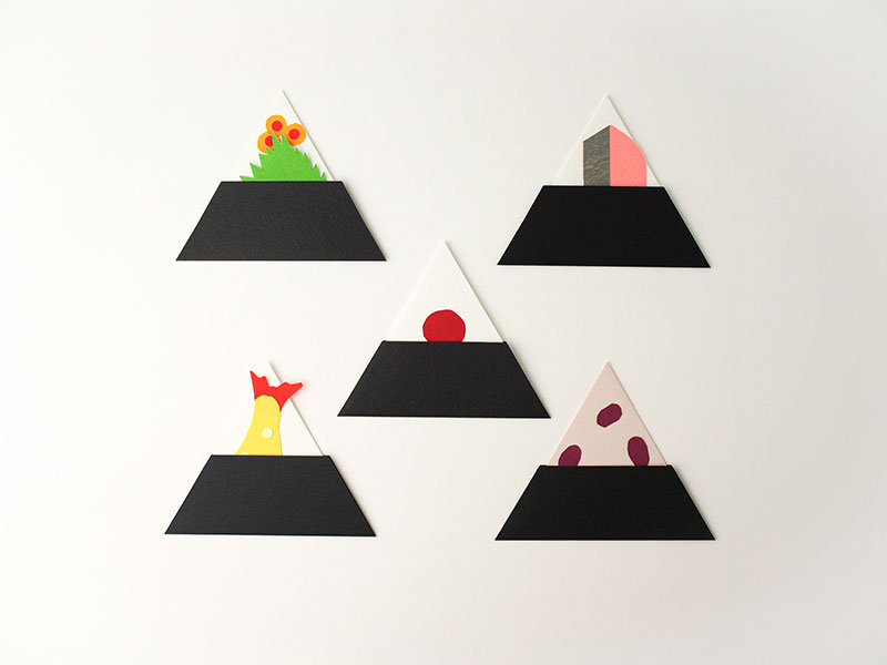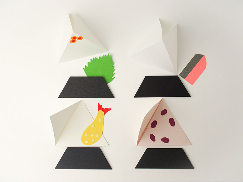 イラストレーターで形に起こして単純なイラストにしてみて、その延長で紙を切ったり折ったりする中で、この形のおにぎりに至りました。