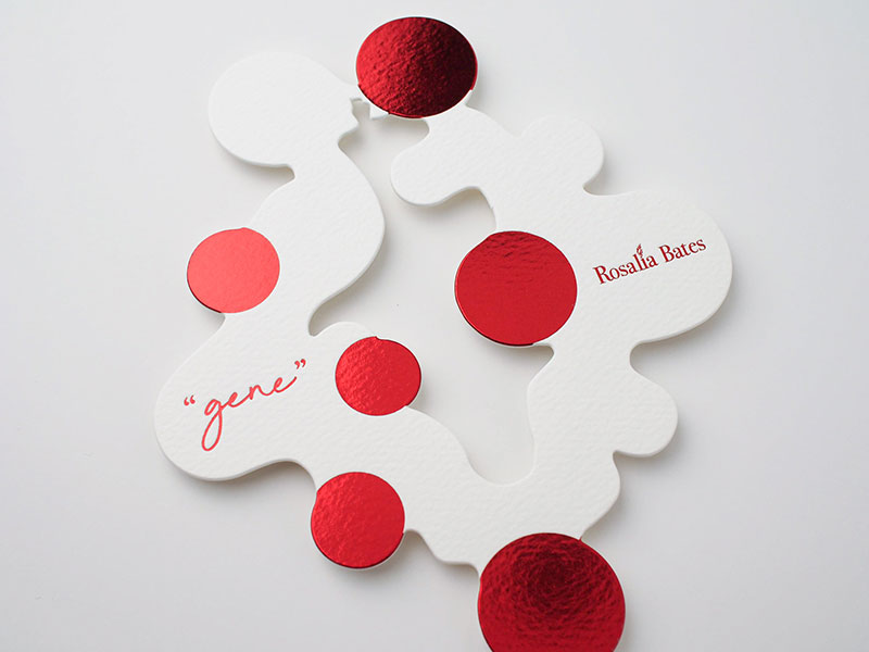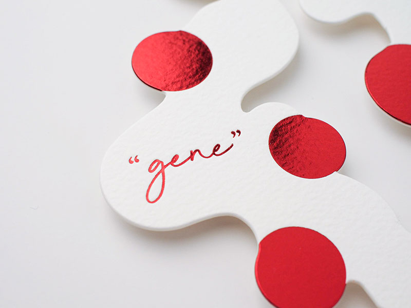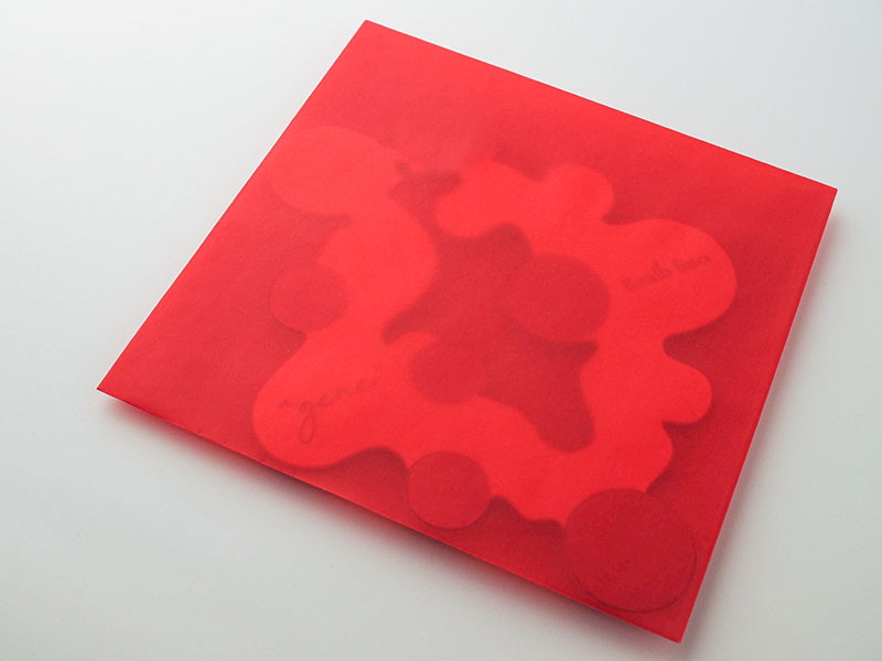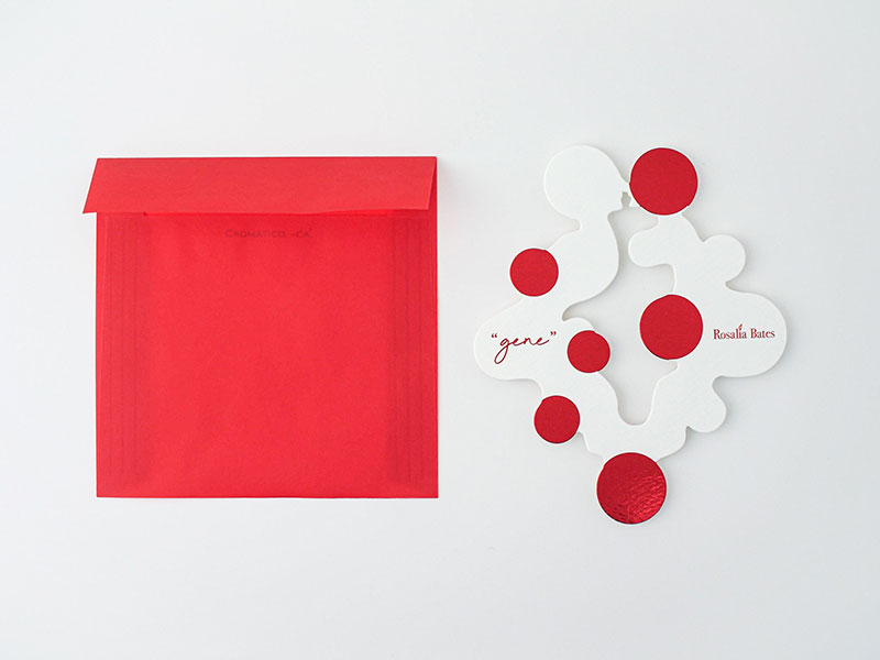 また、個展のテーマである"gene"と、「クロマティコA-FS レッド」の透明感のある赤がイメージにピッタリで「デザイン封筒スクエア」を使用しました。封筒から出した瞬間にきらりと輝くメタリックな赤にドキッとする、素敵なDMになりました。(elle usuiさん)
