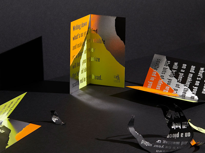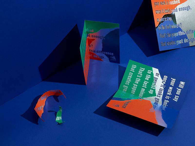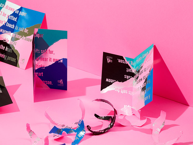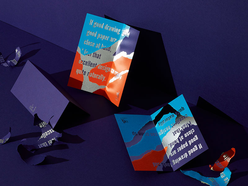 2つ折りのカードを開いた瞬間、内側に現れる鮮やかな3色は、誰もが目にしたことのある有機的な曲線……「手で紙を破る」という方法で作り出されたものです。鮮やかな色の組み合わせと生々しい紙の質感は、マーメイドでなければ生み出すことのできない世界です。