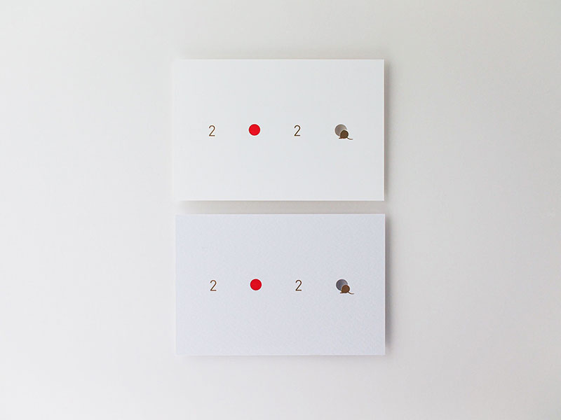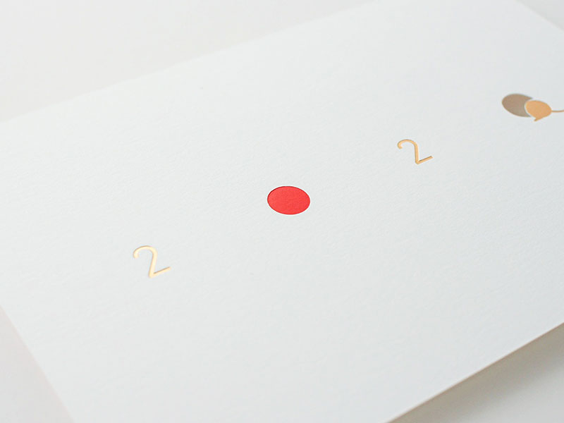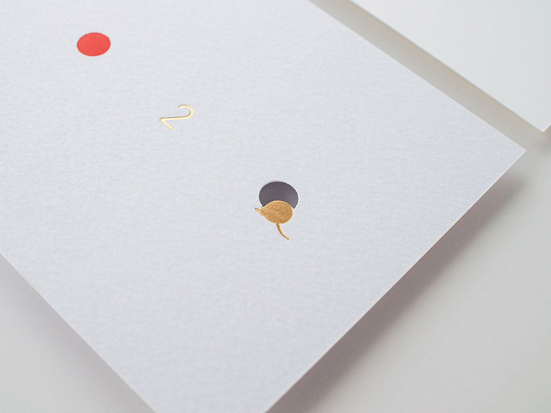 日の丸の赤をイメージした赤箔とおめでたい印象を与える金箔を用いて、年号である「2020」をシンプルなタイポグラフィでデザインし、今年の干支である鼠が巣穴に戻る様子を抜き加工で表現しています。(株式会社竹尾 企画部)