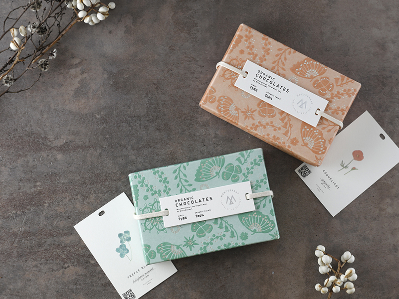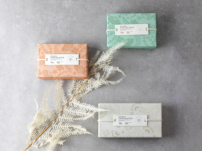 - チョコレートブランド[ MONTSERRAT(モンセラート)]はカカオの栽培から商品加工に至るまで、すべてオーガニックでサステナブルな環境のもと生産を行っています。「パッケージの素材にもサステナブルなものを」という考えから、FSC森林認証紙のブンペルを選びました。ブンペルのホワイトは、少し薄茶色が混ざったような、ナチュラルな白です。そこに、草木染めのような優しい中間色を印刷したところ、ちょうど良い具合に馴染みました。立体的なエンボスの触感が、藁半紙のようなざらっとした手触りと相まって、記憶に残ります。(小玉文さん)