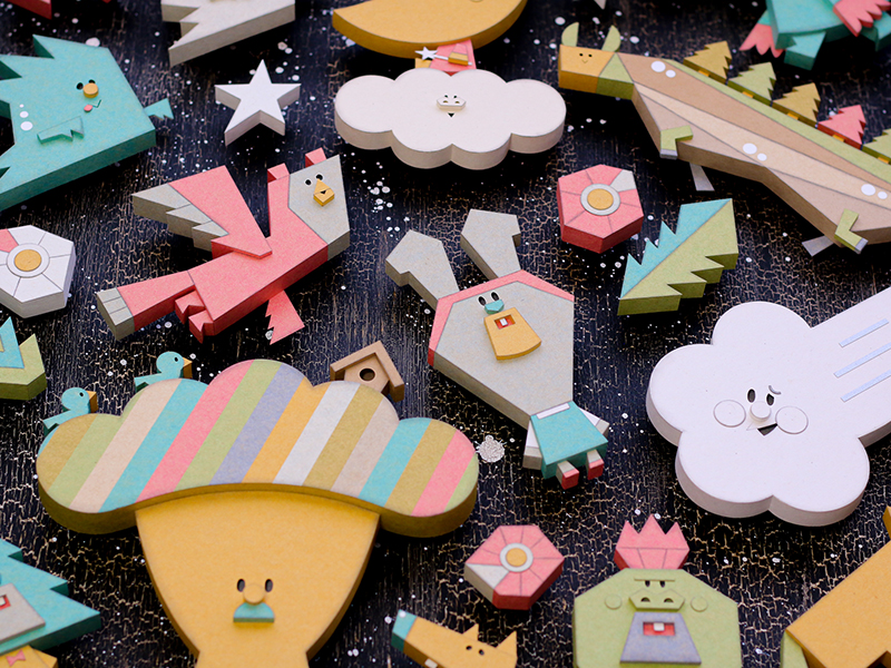 - ファーストヴィンテージの色合いと質感が、ポップなキャラクターたちを落ち着いた雰囲気に見せてくれます。紙のフチにパステルを塗っていますが、馴染みがよく相性も抜群です。イヤリングなどのアクセサリーには、高級感と存在感のある新だん紙 きららとスタードリーム-FSを使用しました。マーメイドやタントは色数と厚みが豊富で、カットや接着、丸みを付ける加工がとてもしやすく、万能です。(松本康孝さん)