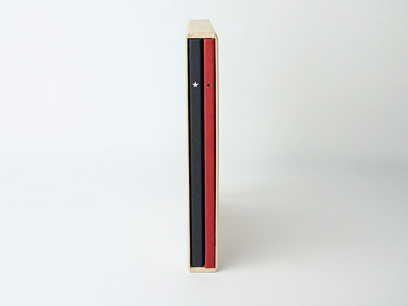 - 髙仲さんの漫画と作品集のお話をいただいた時、その2冊をお揃いの紙で装丁できたらいいなと思いました。元々表紙用に紙で切ったパーツを貼った作品があり、そのイメージを元に、表紙の紙の候補を「黒と赤」に絞りました。髙仲さんの自然いっぱいの暮らしとつなげて、他の候補と検討ののち「ビオトープGA-FS」を選びました。