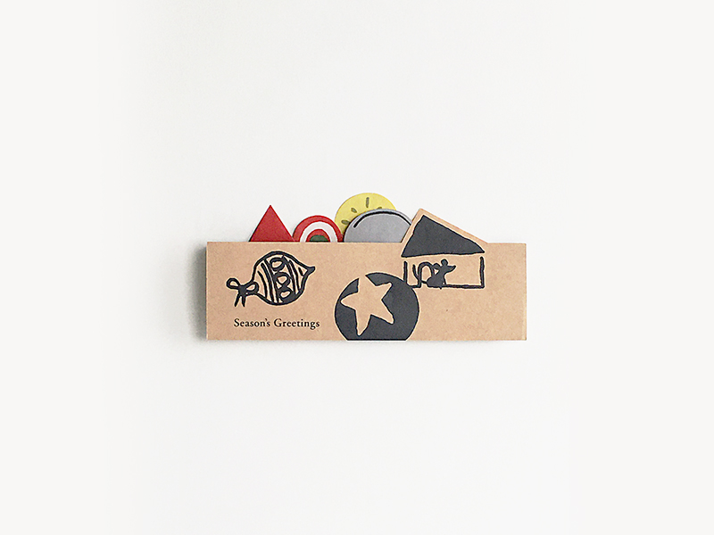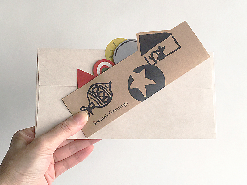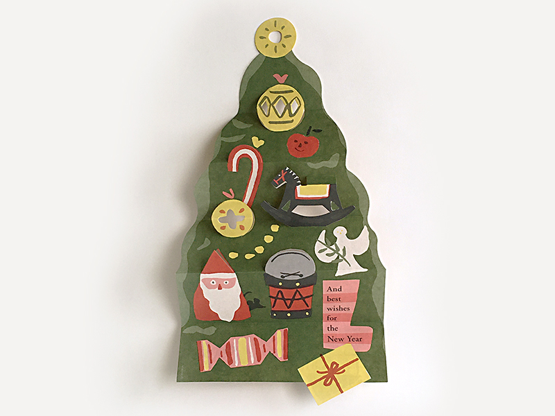 今年はクリスマスの定番・ツリーです。イラストがにぎやかな、チラシのような手軽な質感をイメージ。「クラフトペーパー デュプレN」の片面の白でそれをかなえつつ、畳んだときも裏のクラフトペーパーの茶色と相性の良さそうなカラーでまとめました。閉じた時と開いた時、二つの顔を分かりやすく表現できる素朴ながらも頼もしい紙です。(井手久美子さん)