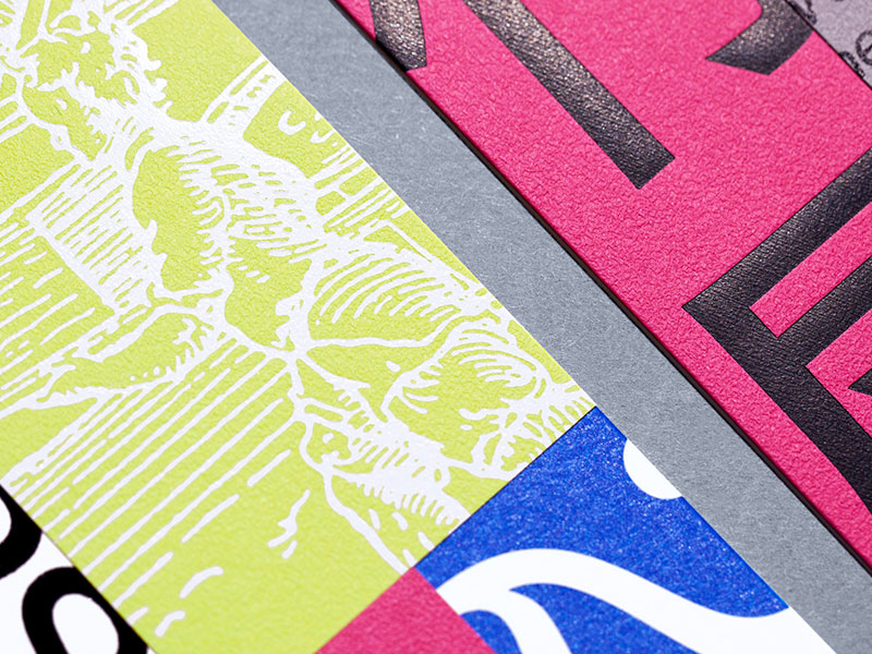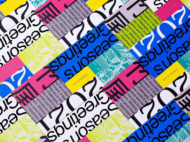 今回のグリーティングカードは、ひとつのカードでありながら様々な印刷物を分割・再構成したように見えるデザインです。多彩な色を揃える二種の紙の様々な色相から、多様性を感じられる色を選定し、竹尾ロゴの紙小僧の原画である版画や竹尾の文字、英語の挨拶など言語に捉われない要素で構成することで、国境を超えるデザインを目指しました。(㎡|emuni 村上雅士さん)