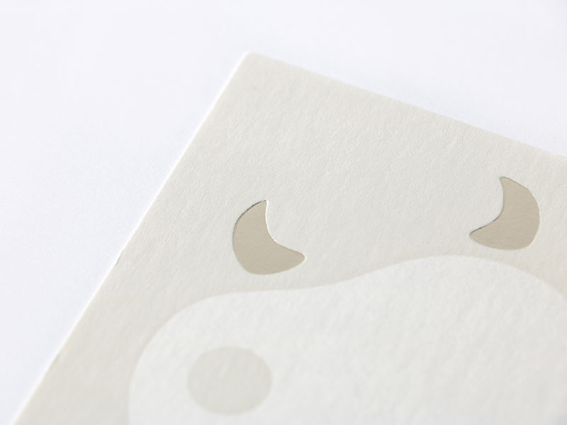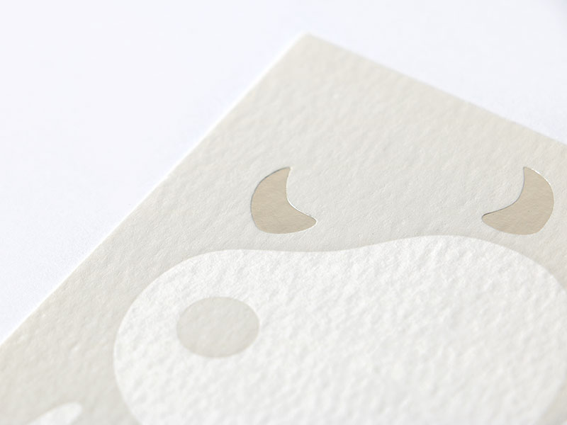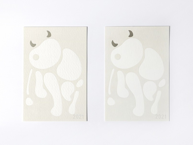 - 2021年の年賀状は、「マーメイド」「気包紙 U-FS」の2種類で制作しました。今にもスタートを切って動き出しそうな躍動感のある、力強い牛の姿が描かれています。角部分はマットシルバーの箔押し、年号と背景は活版印刷、牛の体部分は紙地の白を活かしたデザインです。均一に美しく印刷されたベタ面と紙そのものの白地との質感の差異が際立って感じられる仕上がりになっています。