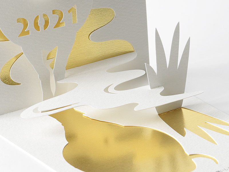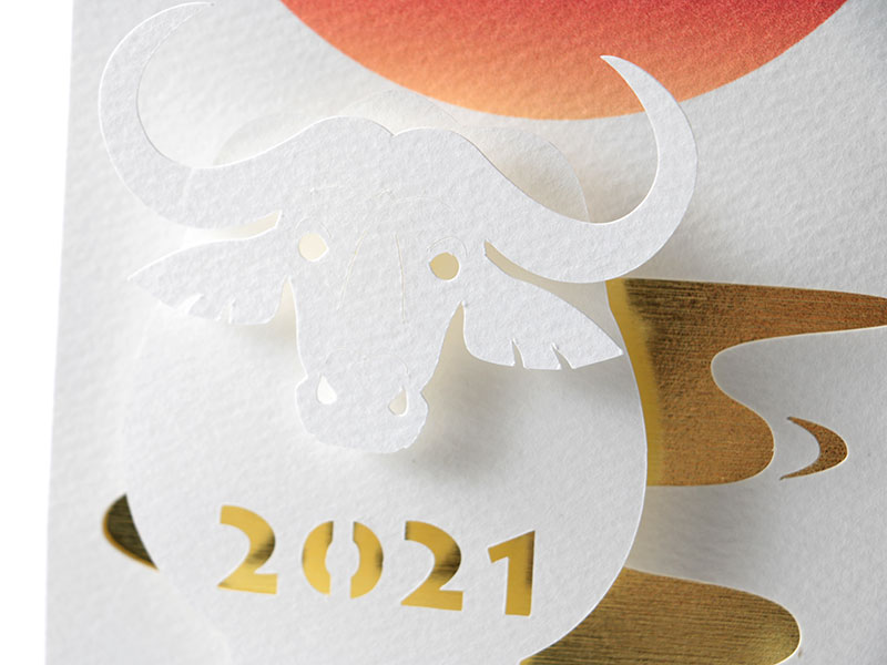 - 干支を切り起こしのポップアップで表現したかったのですが、抜いたあとのシルエットも無駄なく表現に利用したく、水牛なら水面に立つ姿で映り込みに使えると思いました。マーメイドのテクスチャーは裏表の差がほとんど無いので、今回の表現にはピッタリでした。(r.p.mデザインスタジオ 高橋洋一さん)