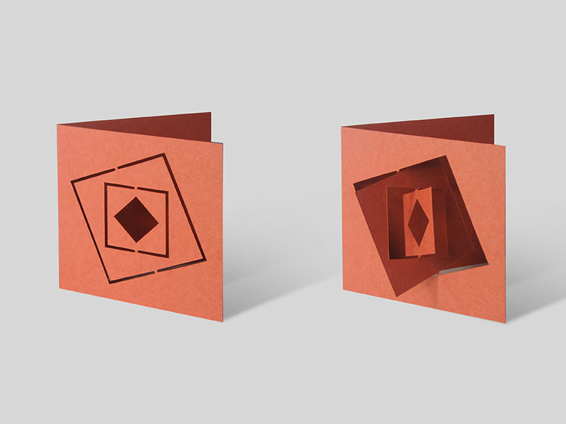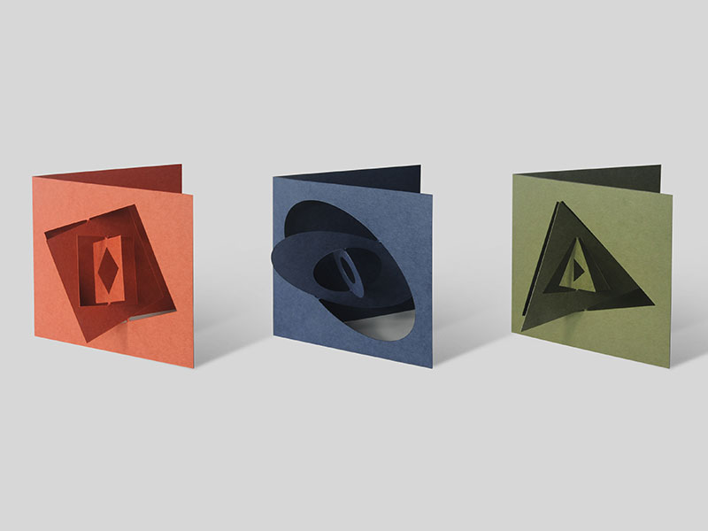 - 「Cartd」はねじれを使ったグリーティングカードのコレクションです。このコレクションを通して、単に平面の物体としてではなく、簡単なねじれを入れることで、グリーティングカードが3次元的な物体になることを見てもらえればと思います。この3点は、コレクションの最初のシリーズ「SHAPES」です。