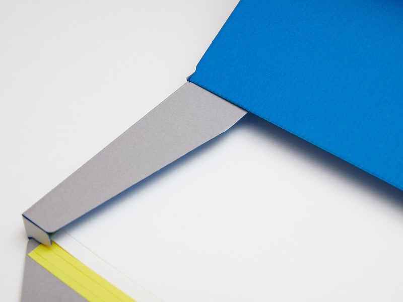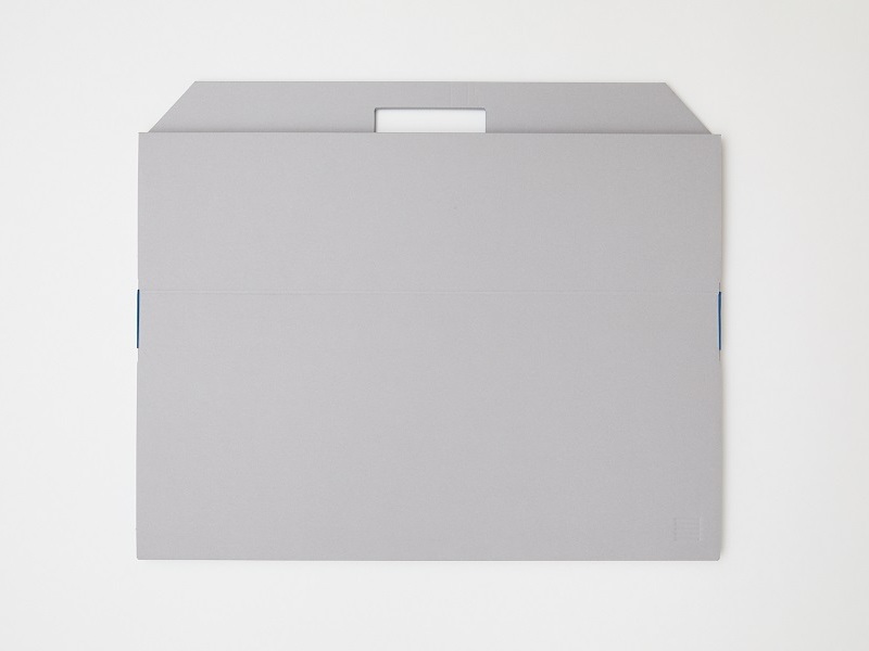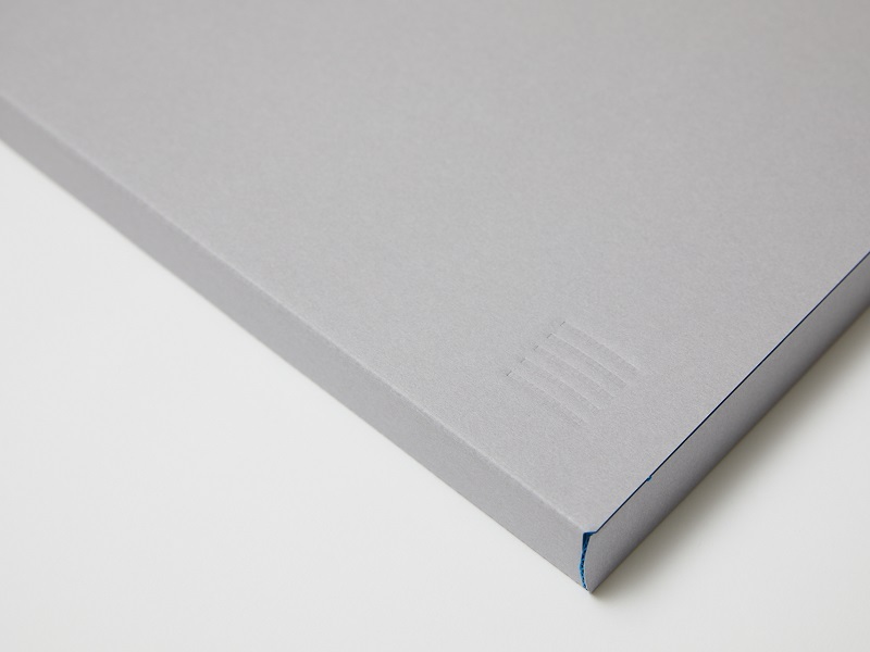 このために作ったオリジナルのファインフルートは、外側のライナーがグレーで中芯と内側は青山見本帖のブランドカラーの青を選びました。ケースの大きさは全判4切サイズがすっぽり入るサイズです。形状は協進印刷の千田健一さんと一緒に、持ちやすさや開きやすさや強度、そしてフォルムも細部まで何度も検証し、長く愛用していただけるよう極力無駄を省きました。最後にロゴもさりげなく空押しして完成。