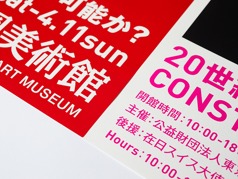 会場に展示されるコレクションのポスターの用紙はほとんどが塗工または非塗工の白の印刷用紙だが、現物を見ると印刷との兼ね合いで多様に感じられた。マットな質感の用紙とインキのグロス感の対比、異なる版式で印刷された紙を貼り合わせたもの、紙をつなぎ合わせたものなど、1枚の紙に図像と文字だけでない情報が付帯されていた。時を経てその魅力が強まったのかもしれない。視覚言語としてのポスターに、物質感を非常に感じた。今回の展覧会告知ポスターも紙と印刷の効果を考えている。同一のデザインに色彩は黒と赤の2種類あり、「ヴァンヌーボVG-FS」にそれぞれインキが2度刷りされている。印刷所と試行錯誤を重ねた、私にとって初めて見る黒と赤だった。用紙の特性を活かした力強いポスターが出来上がった。