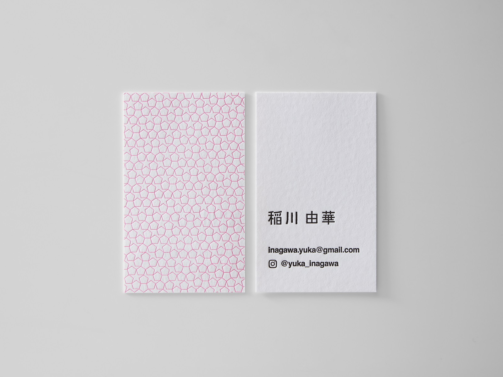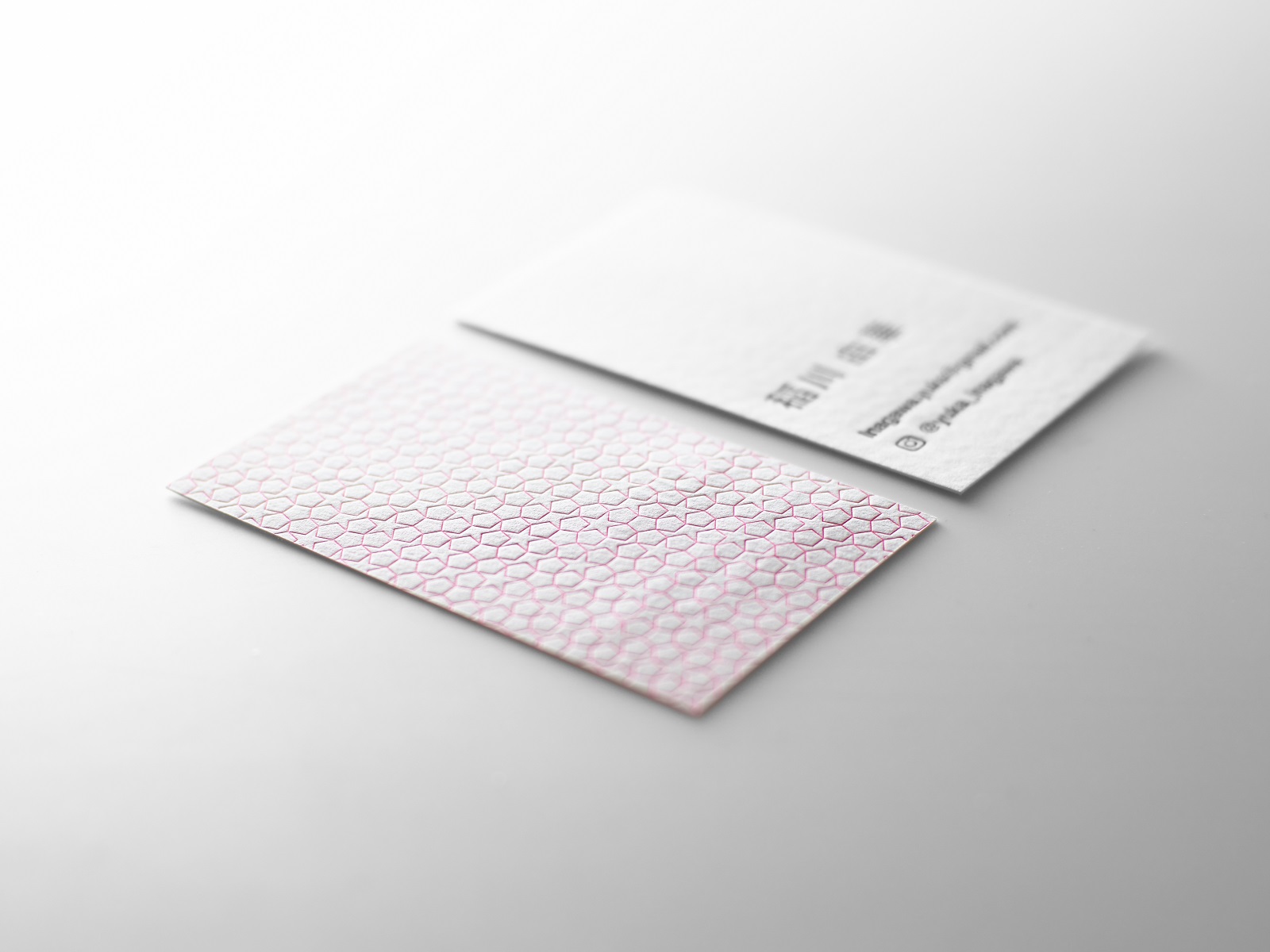 - クライアントは漢方にまつわるお仕事をされる方で、漢方の基本である五行説を表現するため、5角形で紋様を作り、それを活版印刷で表現しています。繊細な紋様が際立つように、かさが厚く柔らかなグムンドコットンを選びました。
