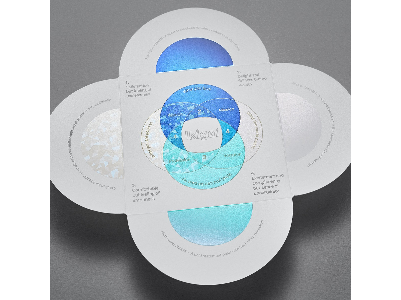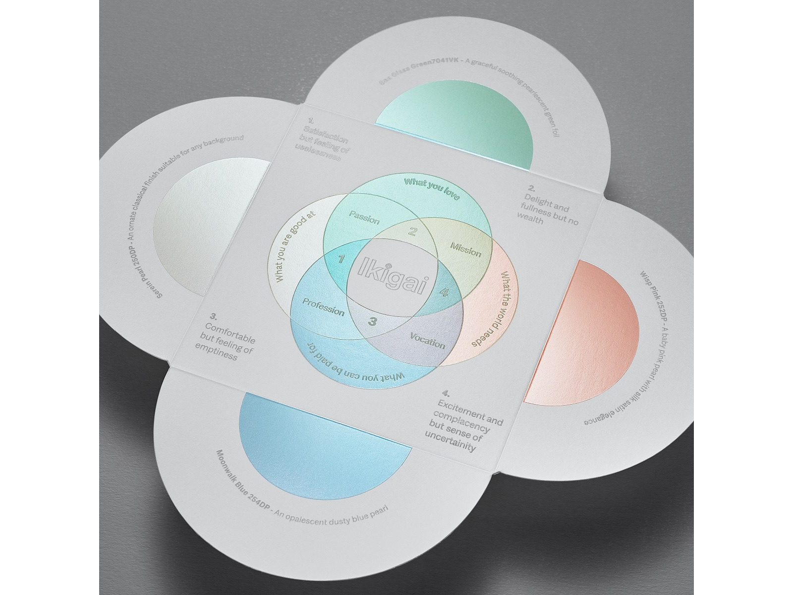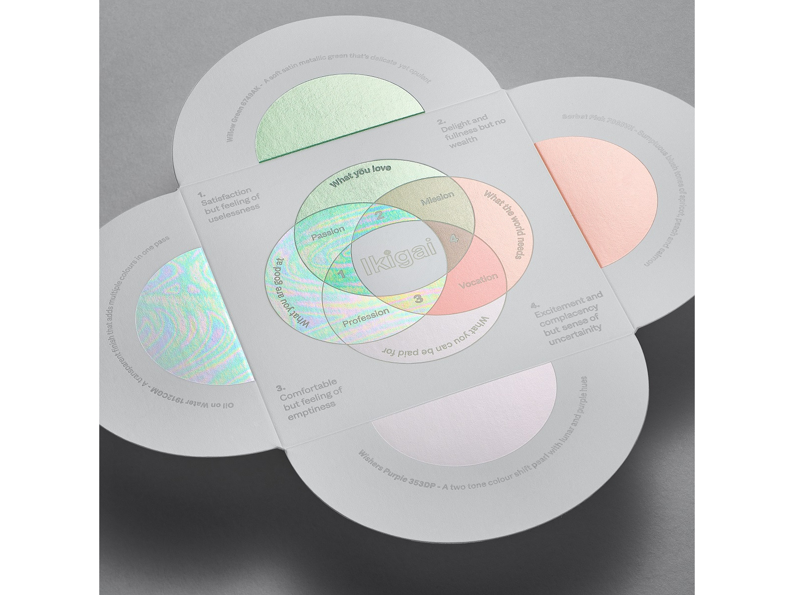 Foilco have always admired Takeo’s heritage, ethos and its range and we had been looking for a project to collaborate on. When we came up the Ikigai project concept there was only one company that sprang to mind. The KIHOUSHI product was the perfect product in thickness (335gsm). It gave us the uncoated luxury look we were looking for alongside the bright whiteness that would compliment the transparent foils were looking to use on the project. The paper had to hold up to being stamped and layered up to and not deteriorate. We stamped up to 4 foils on top of each other. The paper responded well to fine detail text that we applied on both sides at the last stages. (Matt Hornby)