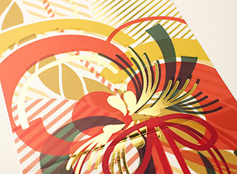 「毎日が特別」=「めでたい日」になりますようにと思いを込めて、日本の伝統であるしめ縄飾りをモチーフに制作しました。縄の一部には、金の箔押しを使用しております。皆様が一年を通して幸せでありますように。