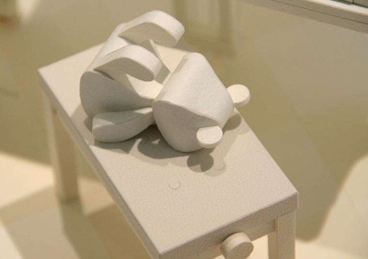 この作品はとても実験的なものでした。最近は錯視(目の錯覚)ブームでしたので、どうにか紙の作品で不思議な体験・見て楽しむことができないかと考えてみました。それで身近にある「鏡の世界」を紙で再現してみようと思いつきました。意図していることが可能かは、シンメトリーにすべて作り終えるまでわかりませんでした。最初から「もし完成しちゃったら送ってみよう」というノリだったのです(笑)人にお見せして鏡になってると告げられた時はほっとしました。 白に統一したのは、見る人のちからをつかって無意識に本来の色へ変換してもらいたいからです。そのためにマーメイドで、黒い部分=ナチュラル、色がある部分=白、白い部分=スノーホワイト、と若干色を変えています(ライティングの環境で違いがわからない場合があります)。その他クロコGAやレザック80ツムギなど、ユニークなエンボス紙があるので使わせていただきました。