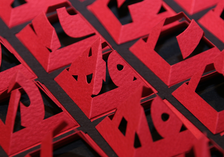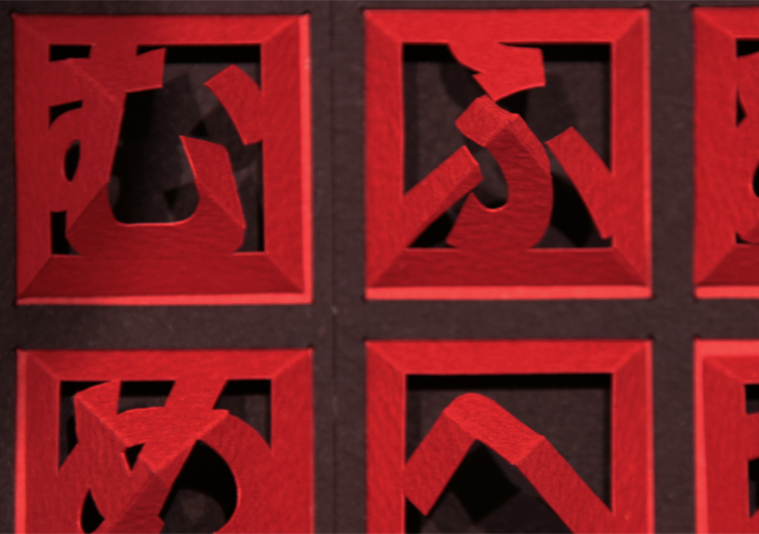 一番初めに暗号をつくりたい!って思ったんです(笑)一見すると何か分らないけれど、あるルールに従うと解読できる。そこからスタートして、横から見ると三角だけど、真上から見ると文字として読める「とがりひらがな」を考えました。1文字1文字動かせるのでメッセージがつくれます!また、私は普段から平面と立体の存在を行ったり来たりする面白さを表現したいと思っています。「とがりひらがな」では、文字という平面的なものを立体に起して、それを真上から見ることを誘導し、再び平面的な文字に戻して見せることを意図しています。 色の組み合わせは赤と黒。インパクトがあるのはもちろんですが、文字が浮き上がって見える視覚的効果や影の見え方など、一番良かったのは赤黒の組み合わせでした。
