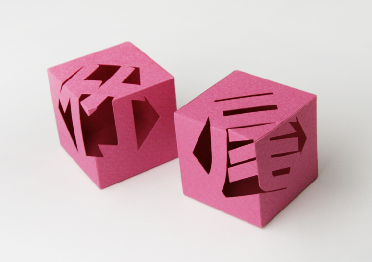 最近の作品としては「とがりひらがな」のシリーズとして立方体のものをつくりました。「竹」と「尾」です。こういった自分のアート作品と浮世絵シリーズのような作品とを両立して制作を続けたいと思っています。