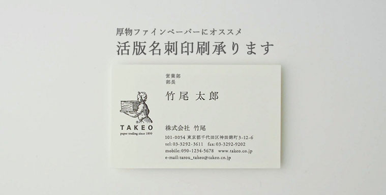竹尾のファインペーパーからお選びいただいた紙に、活版印刷による名刺やショップカードの印刷を承ります。