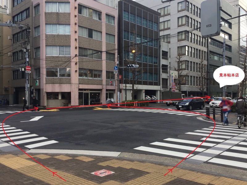 ③千代田通りと交差する交差点で、二つ目の信号をななめ向かいに渡ってください。手前から五つ目の濃いグレーのビル1階、ガラス張りのお店です。