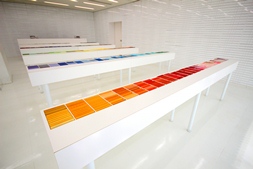 ①検索カードから選ぶ店内に入ると目に飛び込むのが、紙を色のグラデーションに並べた検索テーブルです。 |