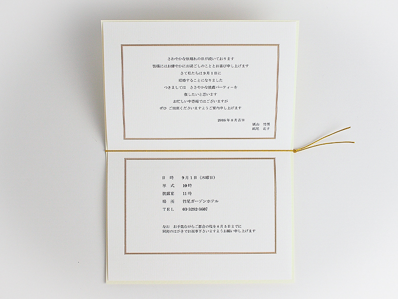 招待状や席次表のカバーにオススメの二つ折りカード、封筒の差出人の印字に便利な名入れ印刷、