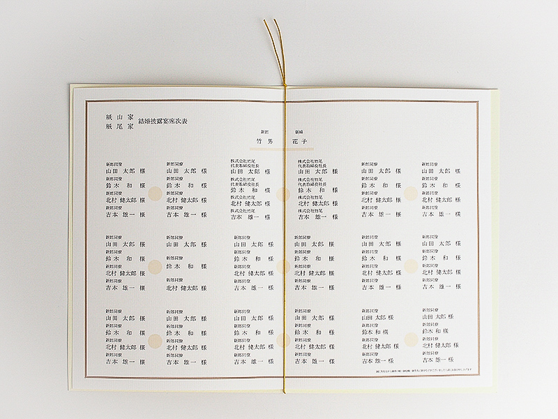結婚式当日にゲストに配る、会場の座席表。招待状と同じく、厚手のカバーの間に文面を印刷した中紙を挟んだ二つ折りタイプが主流です。